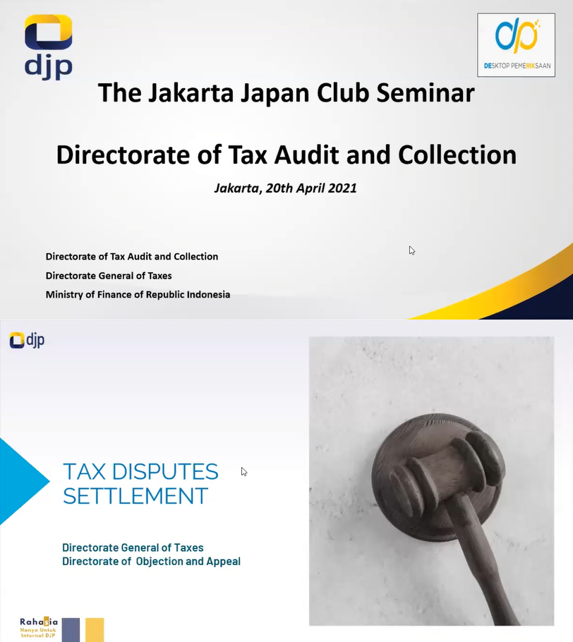 ウェビナーでは、税務監査および徴収局のEdwin Larona Sihaloho, S.E., M. Sc. 氏より「税務監査」のプロセスを中心に講演いただき、異議申し立ておよび上訴総局のYana Setiana, S.E., M.Ak. 氏並びSantoso Wahyu Utomo, S.E., M.M.氏より「税務紛争解決」のプロセスについて、講演をいただきました。