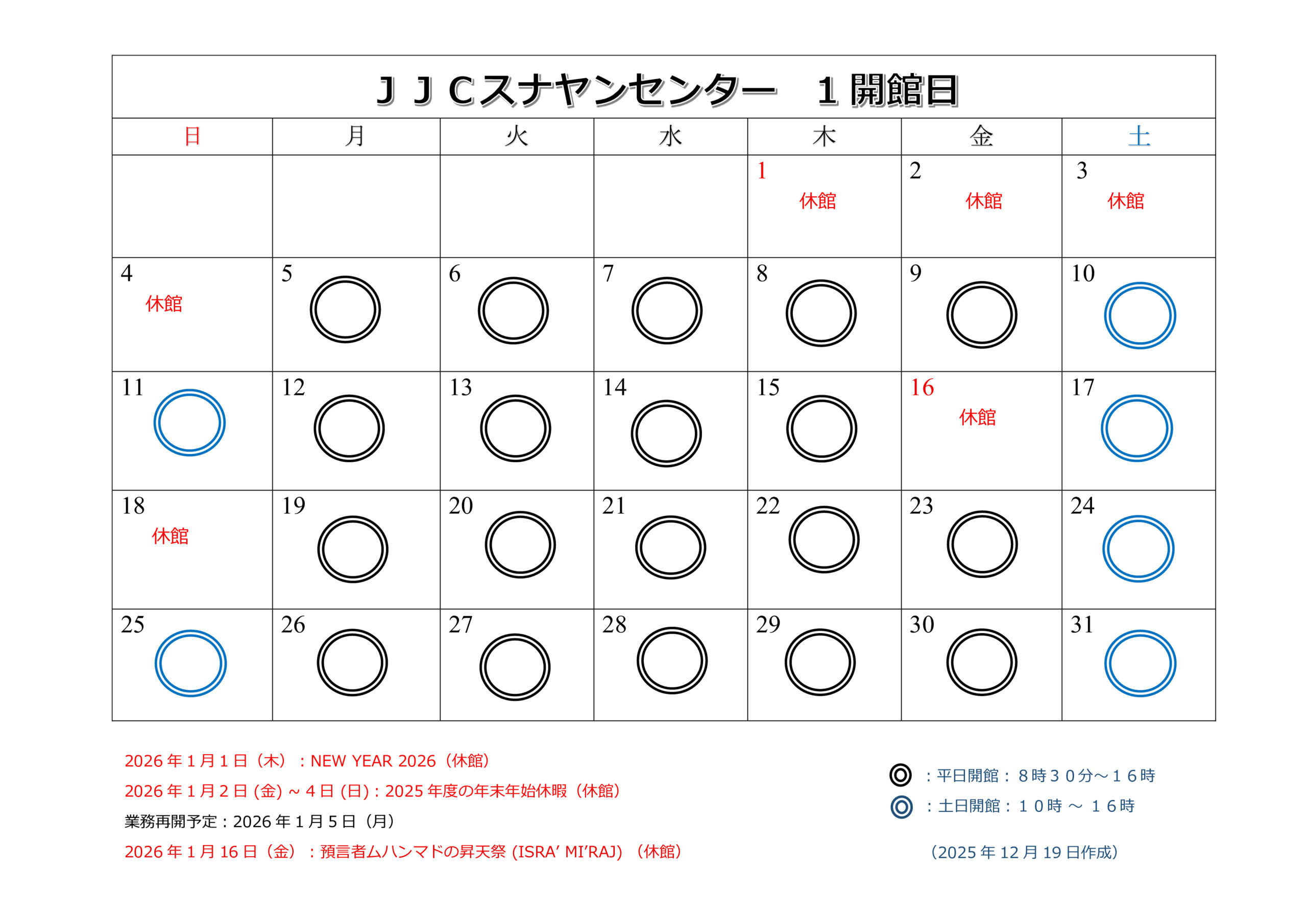 JJCスナヤンセンター開館日