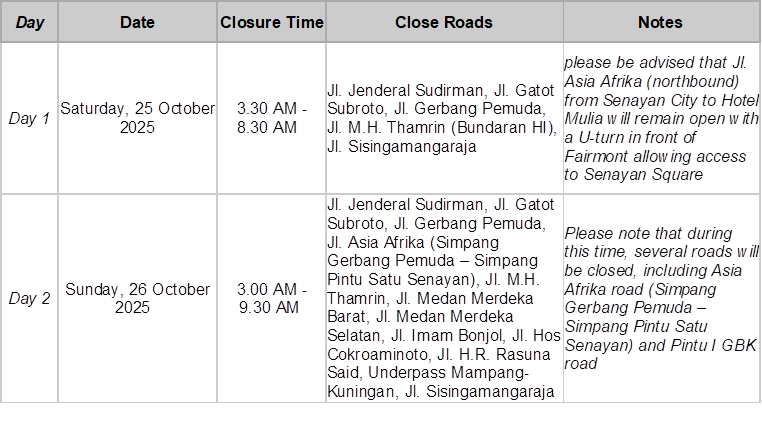 今週末、10月25日(土)と26日(日)にマラソンイベント(JAKARTA RUNNING FESTIVAL)が開催され、スナヤン周辺も一部の道路で朝9時半頃まで交通規制が予定されています。