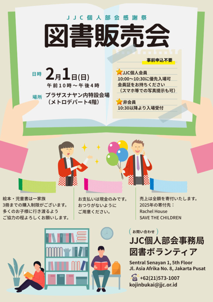 今回の図書販売会は2月1日(日)10:00 ~16:00 の予定です。JJC新春感謝祭との同日・同会場での開催となります。