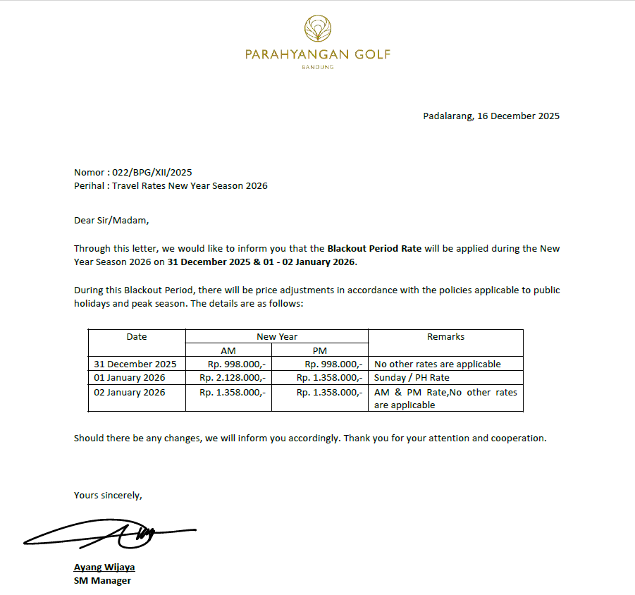 {PARAHYANGAN GOLF} BLACK OUT PERIOD NEW YEAR SEASON 2026